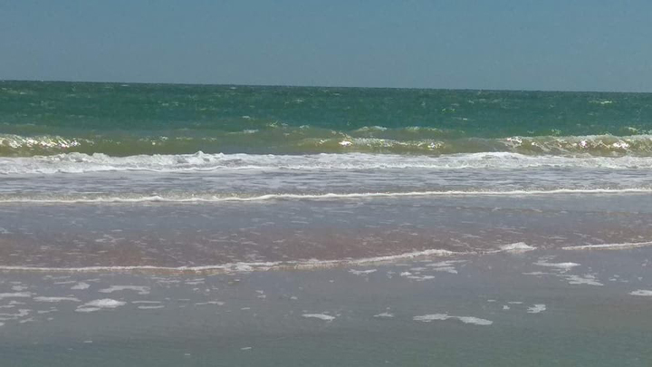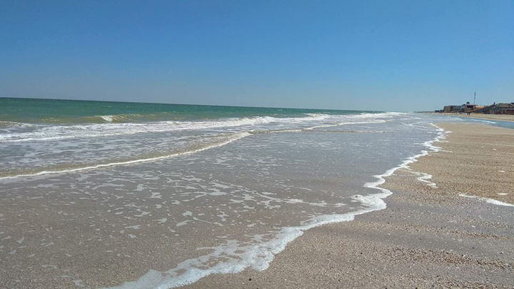 Азовское море выглядит спокойным и ласковым, однако, последствия сильного шторма видны невооруженным взглядом. Вдоль всей линии берега протянулась полоса воды, которая делит пляж, делая его "двойным".