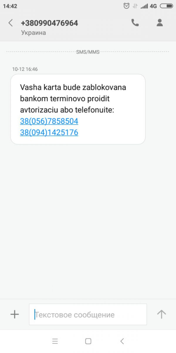 Да мне тоже прищло такое же сообщение. Позвонил в свой банк сказали что СМС банки не отсылают вообще.