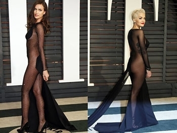 Показать всему миру свою филейную часть решила не только Ирина Шейк, но и британская певица Рита Ора. Она сменила несколько нарядов за вечер, но самым запоминающимся стало прозрачное черное платье от Donna Karan. Нижнее белье звезда проигнорировала, поэтому все могли лицезреть обнаженное тело Риты и ее татуировки. Пятую точку прикрыл черный шлейф. Среди актрис и певиц в элегантных вечерних туалетах, и Ирина Шейк, и Рита Ора смотрелись весьма нелепо.
