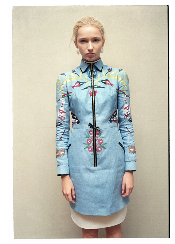 Ирина Каравай предлагает голубой наряд с вышивкой в виде аистов: это современное прочтение традиционного украинского костюма, который, без сомнения, будет особенно популярнее в выпускной.