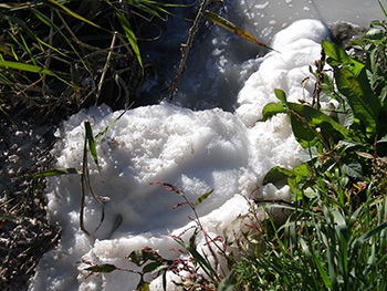 Как удалось выяснить журналистам «МВ», белые стоки непонятного происхождения попадают в воду в районе бывшего кинотеатра "Украина". В том месте дамбу перекрывает насыпь, соединяющая два берега. Под ней проложена труба. На входе в трубу вода чистая, на выходе - грязная.