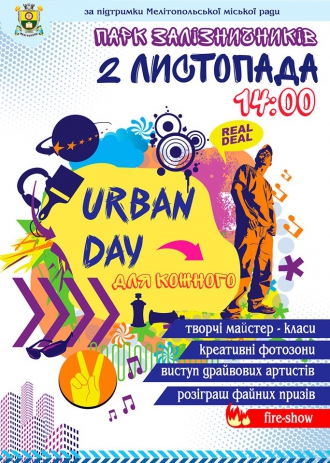 2 ноября мелитопольцев и гостей города зовут на URBAN DAY. Стартует мероприятие в 14.00 парке железнодорожников у Дома культуры. Соответствующая афиша появилась на странице городского отдела культуры в Фейсбук.