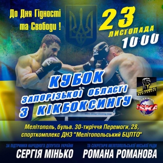 Завтра, 23 ноября, в 10.00, ко Дню достоинства и свободы пройдет Кубок Запорожской области по кикбоксингу. Организаторами соревнований выступают Федерация кикбоксинга ISKA совместно с ОО "Союз участников АТО Мелитополя"