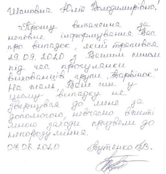 «Уважаемая Юлия Владимировна. Прошу извинение за неполное информирование Вас о случае, который произошел 29.09.200 (ред. с датой допущена ошибка) с Вашим сыном во время прогулки воспитанников группы «Барвинок». К сожалению, Ваш сын не обратился ко мне за помощью, не вовремя принятые меры привели к недопонимаю».
