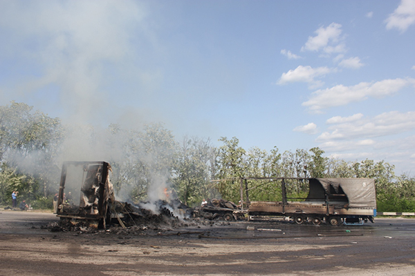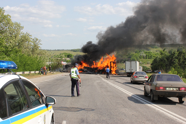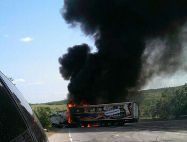 Сообщение о ДТП в районе Степногорска поступило в 14.58. Произошло столкновение двух фур (одна из них от сети"Сильпо"), которые ехали на встречных направлениях. После столкновения, машины загорелись. Разлился бензин по трассе, который также загорался. Образовалась пробка.