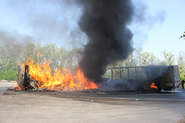 По сообщению пресс-службы ГСЧС в Запорожской области, они направили на место аварии 13 сутрудников и 3 машины. Для тушения использовали воду и пену. Вытаскивали из кабины одной из фур тело погибшего водителя.