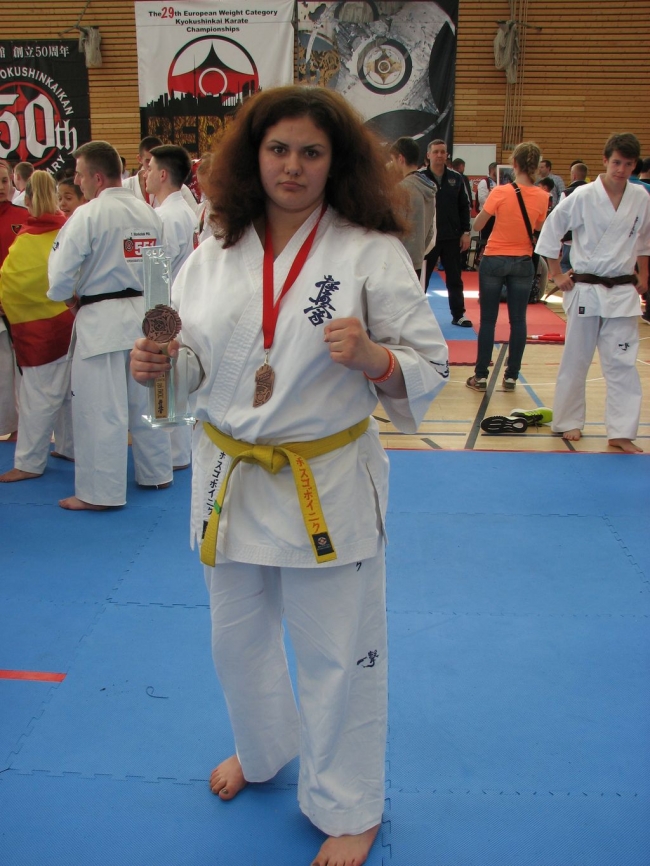 Бронзовая медаль, оригинальный кубок и сертификат, подтверждающий занятое третье место на чемпионате Европы по киокушинкай каратэ среди девушек 16-17 лет в весовой категории свыше 60 кг - таковы берлинские "сувениры" чемпионки Украины и Молдовы, обладательницы Кубка Украины, кандидата в мастера спорта Украины О. Воскобойник. По словам ее тренера Е. Виниченко, прошедший турнир стал самым массовым в истории проведения чемпионатов Европы. Практически все страны континента, Россия, Казахстан делегировали на эти соревнования около 600 спортсменов. Состязания шли сразу на четырех татами. В течение одного дня состоялись соревнования по ката и кумитэ.