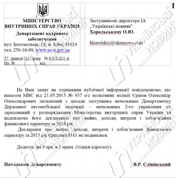 Согласно ответу МВД, заявление об увольнении с занимаемой должности, которое Ершов подписал после скандала с выявлением СМИ несоответствия между доходами милиционера и уровнем жизни его и его дочерей, было удовлетворено министром. Приказом МВД №937 от 21 мая Ершов был уволен с занимаемой должности заместителя начальника департамента.