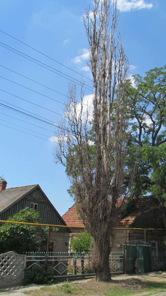 - Примерно шесть лет назад наша квартальная собирала собрание жильцов улицы, мы все подписались под заявкой на обрезку деревьев. Но по результатам переговоров квартальной с чиновниками она нам сказала, что деревья обрежут "32 декабря". Позже некоторые соседи решили сами обрезать деревья около своих домов, заказали вышку, обрезали, а потом заплатили за это еще и штраф, более чем 2 тысячи гривен. А месяц назад и вовсе произошло то, что не на шутку напугало нас, наших соседей и пассажиров маршрутного транспорта, следующего по нашей улице. 30 апреля в городе прошла сильная гроза с градом. Тогда молния ударила прямиком в этот сухой тополь. Щепки разлетелись по всей округе, но само дерево чудом устояло.