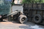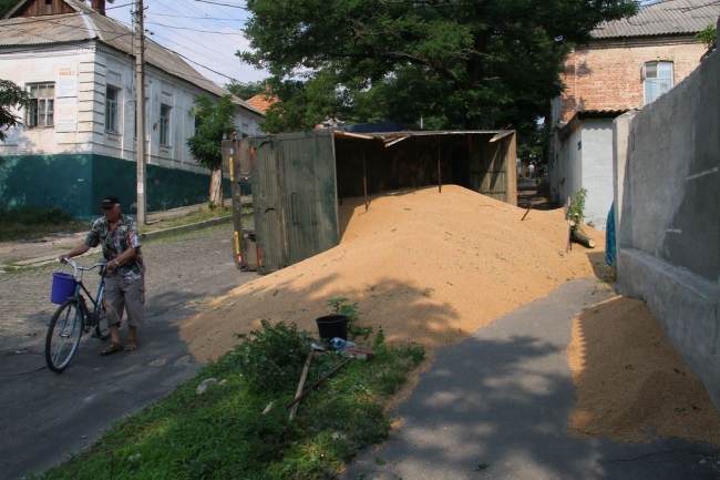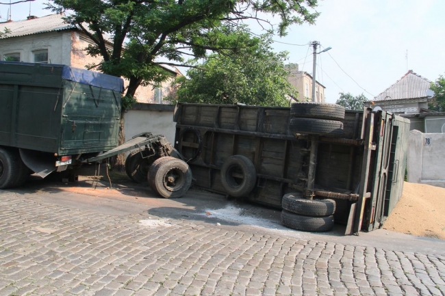 В общем, около часу ночи в машине сломалось крепление, на котором держится прицеп, он перевернулся, зацепил дерево, остановился буквально в паре метров от стены. Зерно высыпалось. Из-за аварии проезжая часть наполовину оказалась перекрыта.
