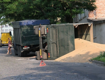 На ул. Дзержинского со вчерашней ночи лежит перевернутый зерновоз. Жильцы соседних домов говорят, что аварии вполне можно было бы избежать, если бы на подъеме стояли соответствующие знаки, а городские службы вовремя отреагировали на просьбы помочь.