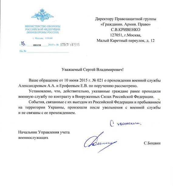 Как следует из ответа Минобороны, копией которого располагает издание, сержант Александров и капитан Ерофеевдействительно проходили военную службу в России, однако приехали в Украину уже после увольнения. Документ поступил от имени начальника управления учета военнослужащих Минобороны РФ Сергея Боцвина.