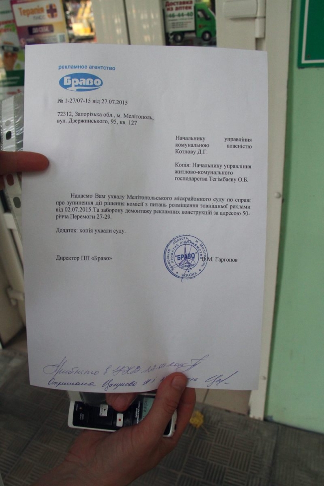 О том, что именно сегодня рекламные конструкции будут убраны, владельца никто не предупредил. Более того, по словам Виталия, еще не прошло 10 дней с момента получения им письма-предупреждения о демонтаже. Также никто не отреагировал на решение суда о запрете демонтажа.