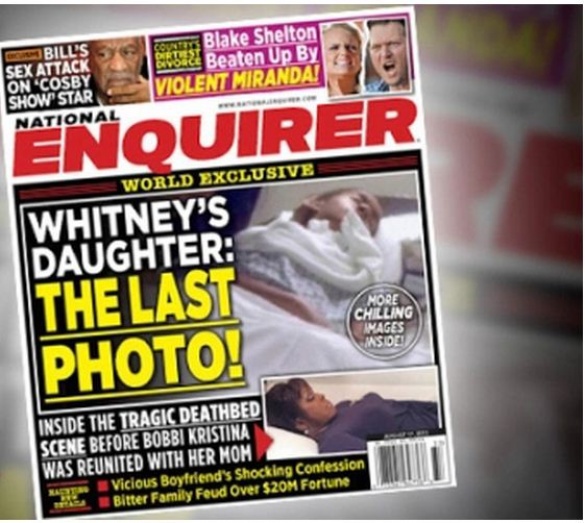 В минувший вторник очередной номер американского таблоида National Enquirer вышел с фотографией Бобби Кристины Браун на обложке. Изданию удалось получить эксклюзивное фото скончавшейся несколько дней назад девушки, сделанное еще при жизни. Фотография, судя по всему – последнее фото единственной дочери Уитни Хьюстон, сделанное за несколько дней до ее смерти в хосписе. Обложку украшает сенсационная надпись, гласящая "больше шокирующих фото внутри номера".