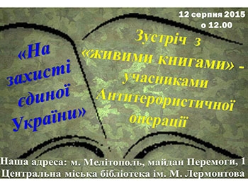 Как сообщили в ЦГБ им. М. Лермонтова, все желающие мелитопольцы могут прийти в 12.00 в читальный зал библиотеки на встречу с "живыми книгами", в роли которых выступят военнослужащие, отстаивающие единство и независимость нашей страны в зоне АТО. Они расскажут истории своей жизни, о службе и боевых товарищах, ответят на вопросы читателей. Встреча будет иллюстрирована фотографиями и видеофрагментами.