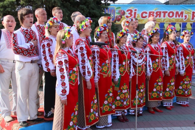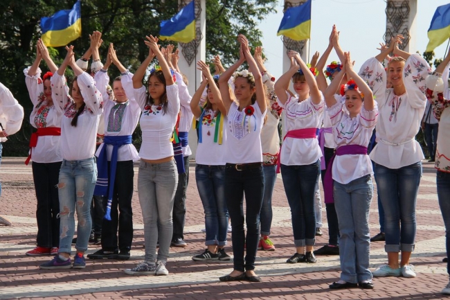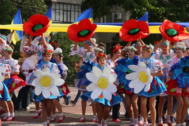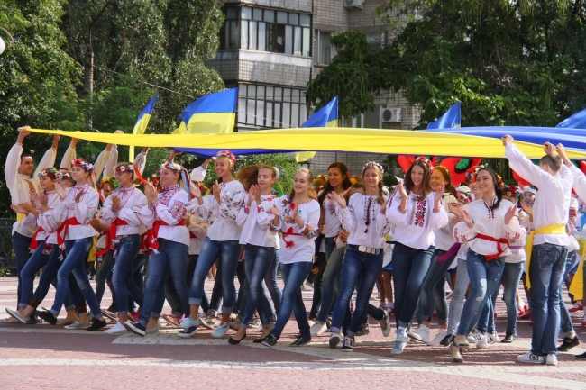 На пл. Победы было ярко и солнечно. На фоне синего неба трепетали сине-желтые флаги, а множество горожан пришли в вышиванках и веночках.