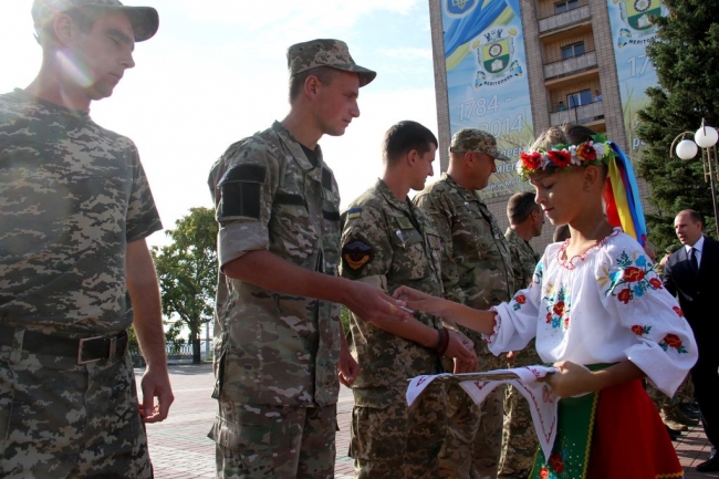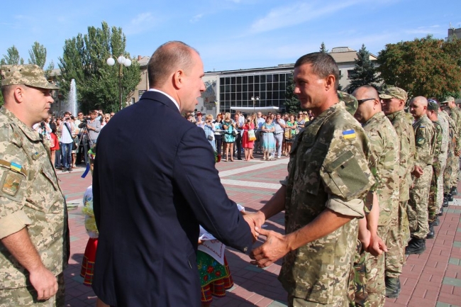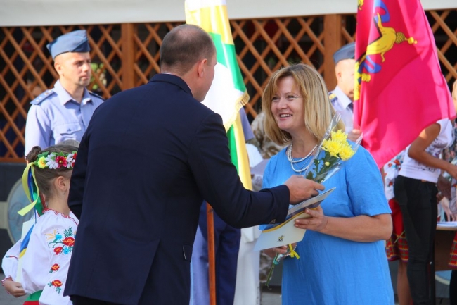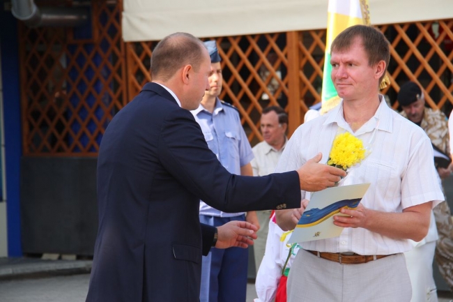 Началась торжественная часть с вручения значков участникам боевых действий на Востоке Украины. 39 человек получили знаки отличия за то, что защищали Родину в АТО. Кроме того, были награждены командир нашего подразделения Нацгвардии Юрий Рой и служащий мелитопольской авиабригады Владимир Бурцев.