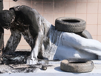 Сейчас значительная часть мемориала загрязнена сажей. От огня пострадали и расположенные рядом пихты, похоже, их тоже пытались поджечь намерено, но огонь дальше не распространился.