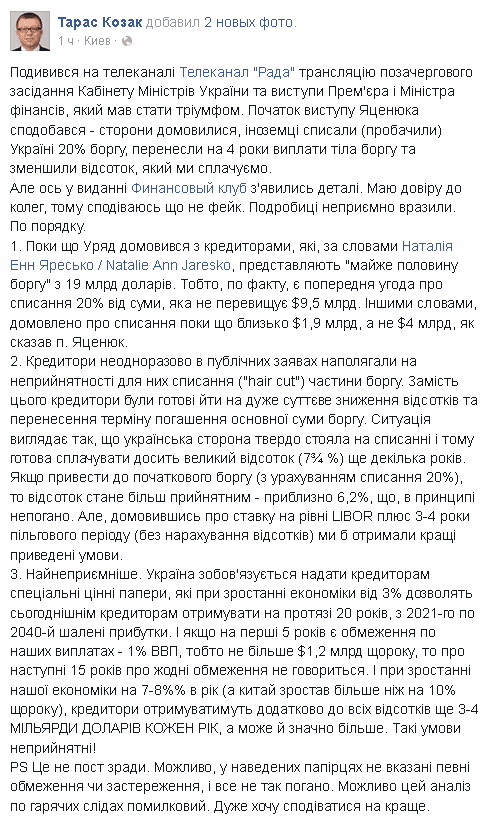 "Посмотрел на телеканале "Рада" трансляцию внеочередного заседания Кабинета Министров Украины и выступления премьера и министра финансов, который должен был стать триумфом. Начало выступления Яценюка понравился - стороны договорились, иностранцы списали (простили) Украине 20% долга, перенесли на 4 года выплаты тела долга и уменьшили процент, который мы платим. Но вот в издании Финансовый клуб появились детали. Имею доверие к коллегам, поэтому надеюсь, что это не фейк. Подробности неприятно поразили" - пишет Козак.