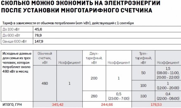 Киевлянин Вадим Кобзаренко, который пользуется трехтарифным счетчиком уже год, говорит, что он позволяет сэкономить, но лишь в том случае, если потребитель сумеет правильно организовать себя и близких: «У нас частный дом, где живет несколько семей. Расходы на электричество достигали 1,5 тыс. грн. И это по старым тарифам! После установки многотарифного счетчика они даже выросли. Пришлось составить «энергетическую диету». Мы договорились стиральные и посудомоечные машины включать лишь поздно вечером или ночью, принимать душ, так как установлены бойлеры, лишь с утра (до 8:00) и тоже поздно вечером, поставили несколько лампочек с сенсорным механизмом выключения. А вот холодильник, телевизор и компьютер «тянут» мало. В итоге счет за электричество не превышает 400 грн в месяц.
