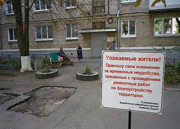 Напомним, что на этой недели в местах проведения ремонта внутридворовых дорог появились таблички от имени городского головы Бердянска Алексея Бакая. Градоначальник просит прощения у жителей города за временные неудобства.