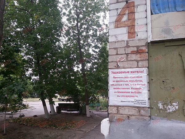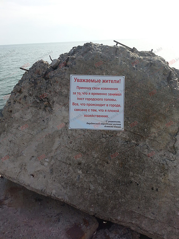 Ответ горожан на такую PR-кампанию не заставил себя долго ждать. В разных микрорайонах города появились таблички похожего дизайна и с подписью Алексея Бакая, но смысл написанного отличается кардинально. В тексте послания говорится, что городской голова просит у жителей прощения за временные неудобства в связи с тем, что он плохой хозяйственник, и выражает надежду, что на ближайших выборах бердянцы это исправят.