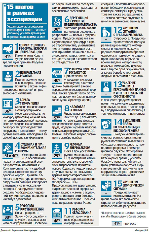 СТАВЯТ ГАЛОЧКИ. Власть прогресс по имплементации реформ оценивает достаточно оптимистично. Так, Нацсовет реформ, который исследует прогресс внедрения новшеств, посчитал, что налоговая реформа выполнена уже на 57%. Также неплохо движется реформа МВД и образования. А вот в борьбе с коррупцией прогресс пока составляет лишь 36%: хотя Нацбюро по борьбе с коррупцией создано и часть детективов уже приступила к работе, но антикоррупционный прокурор пока не назначен. Тормозим мы также с реформами в госуправлении и в энергосекторе, но здесь, по мнению экспертов, проблема кроется не в сознательном затягивании, а в сложной политической и экономической ситуации.