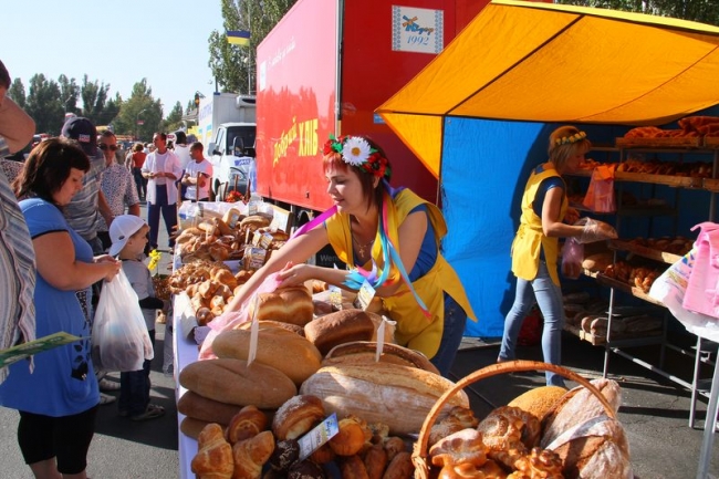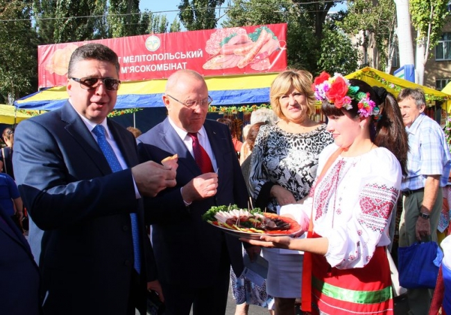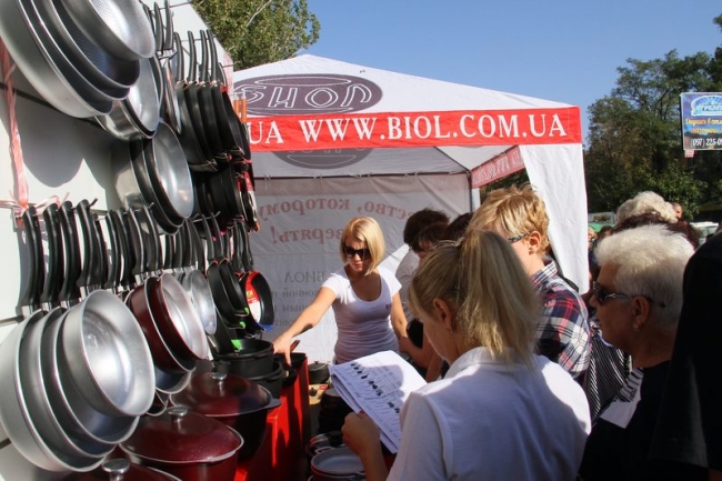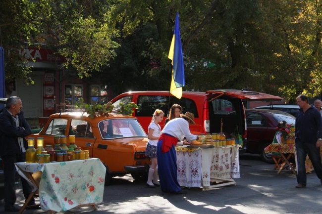Чего только не было на прилавках и столиках. И, нужно признаться, цены на продукцию радовали. Все желающие могли приобрести свежее сало по 50 грн. за кг или кровяную колбасу по 60 грн. за кг., красивейшие яблоки по 5-7 грн за кило, подсолнечное масло по 20 грн. за 1 литр, конфеты в ассортименте по 55 грн. за сладкий килограмм, саженцы роз от 15 грн за куст, а также ароматные хлебобулочные и кондитерские изделия, молочную и мясную продукцию местных производителей, рыбу и морепродукты, фрукты, овощи и бахчевые культуры, мед и многое другое. Особенно много народу толпилось у палаток с фруктами от «Мелитопольской черешни» и рыбкой от ТМ «Темеринда». А самым популярным лакомством в праздник стал «дывень» - сдоба на длинной палочке, которую раньше принято было дарить гостям на свадьбе. Это сладкое угощение предлагали наши хлебопеки по 13-15 грн за штуку.