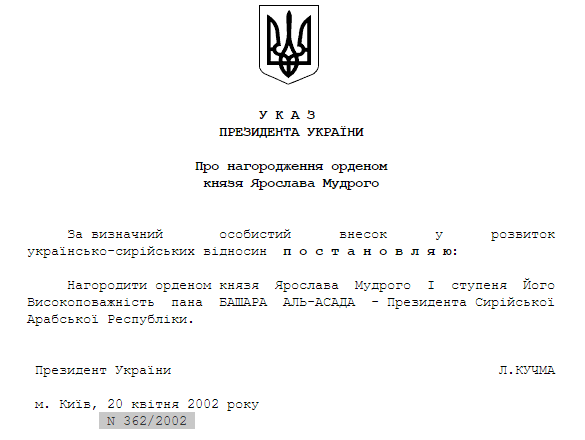 Президент Сирии Башар Аль-Асад в Украине был награжден орденом Ярослава Мудрого.
