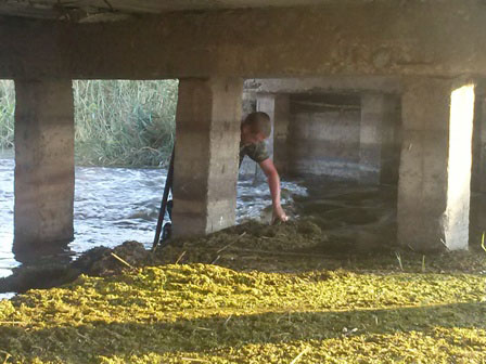 - В прошлом году такого не было, - говорит Сергей Гончаренко, начальник Степановского природоохранного отдела Приазовского национального природоохранного парка (ПНПП). - Мы тогда расчистили Молочную только раз – после весны, когда был естественный затор реки после зимы. Лето 2015 года было урожайным на ряску – кормовую базу водно-болотных птиц. Ряски выросло очень много, поэтому забивается отверстие очень быстро. Первую искусственную дамбу здесь поставили месяц назад. Мы уже трижды демонтировали сооружение из бута, чтобы дать возможность рыбе свободно плыть по реке. Но находятся люди, которые снова и снова строят искусственную запруду. Для местных жителей выгода в этом немалая: они ловят тут рыбу на удочку и ставят сети. Делает дамбу несколько человек сообща, во время патрулирования этого участка мы ищем нарушителей, но пока мы не смогли их задержать. Поэтому наша задача – хотя бы расчищать это место, делая естественным уровень воды.