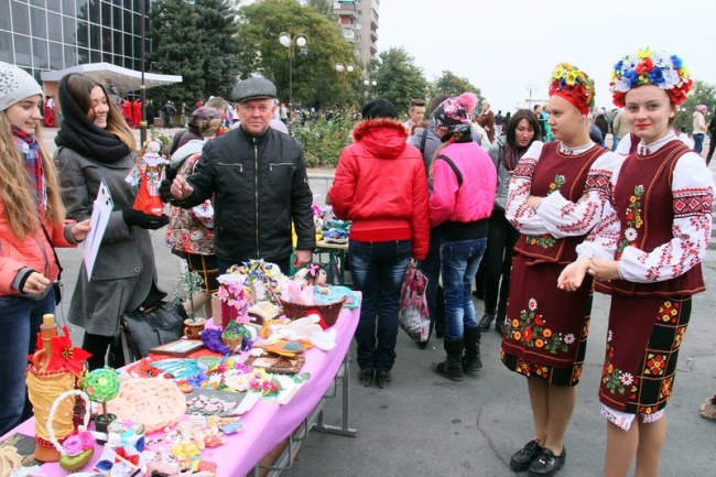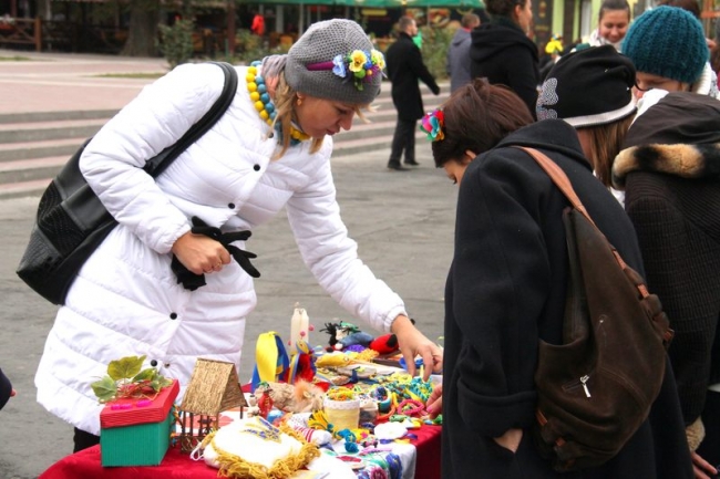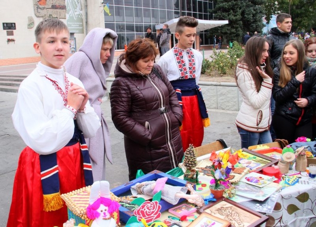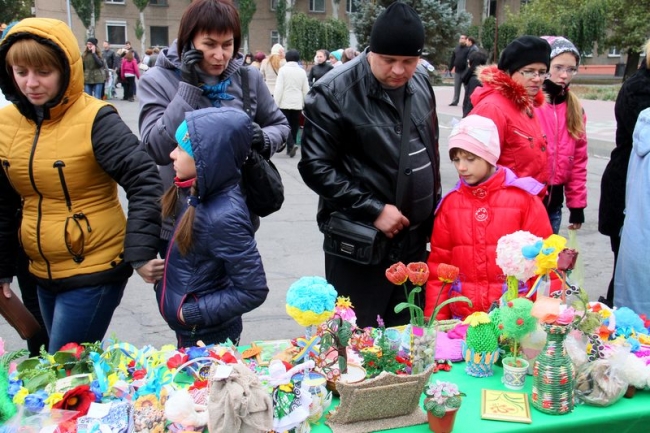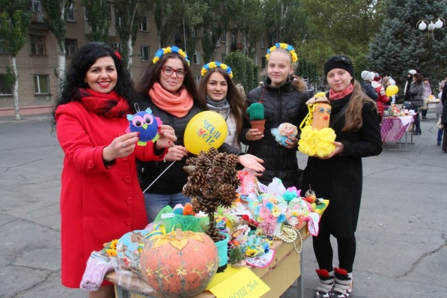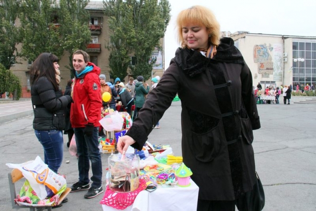 Встречали мелитопольцев на главной городской площади участники благотворительной ярмарки - представители школьных и детсадовских коллективов, которые предлагали купить изделия hand-made всех цветов и размеров: от брелоков и карандашиков до деревьев из бисера и лент. Кроме того, каждый желающий помочь украинским военнослужащим мог опустить энную сумму в прозрачную коробку для сбора пожертвований.