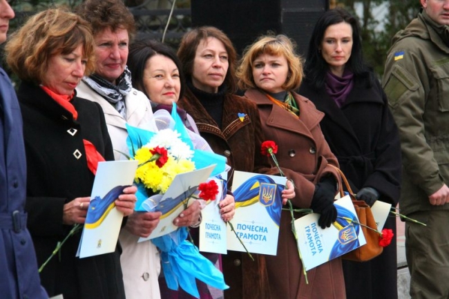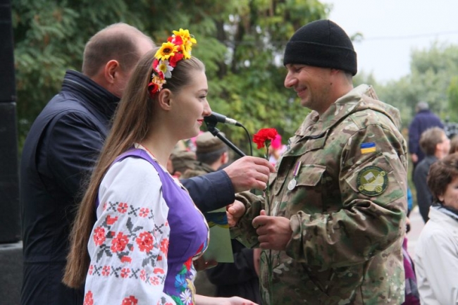 Открыли торжества по случаю Дня защитника Украины "Привітальним танцем" артисты народного ансамбля народного танца "Червона калина" (рук. Николай Себастиянский) Мелитопольского училища культуры. После последних аккордов национального гимна со словами поздравления мужественным защитникам Отечества, волонтерам и добровольцам, всем мелитопольцам обратился секретарь горсовета, и.о. мэра Сергей Минько. Он же вручил почетные грамоты горсовета за ответственное исполнение конституционных обязанностей по защите Родины, высокое профессиональное мастерство, успехи в боевой подготовке, образцовую воинскую дисциплину военнослужащим 25-й гвардейской бригады транспортной авиации, второго патрульного батальона в/ч 3033, Мелитопольского объединенного военкомата и взвода его охраны, налоговой милиции Мелитопольской объединенной государственной инспекции.