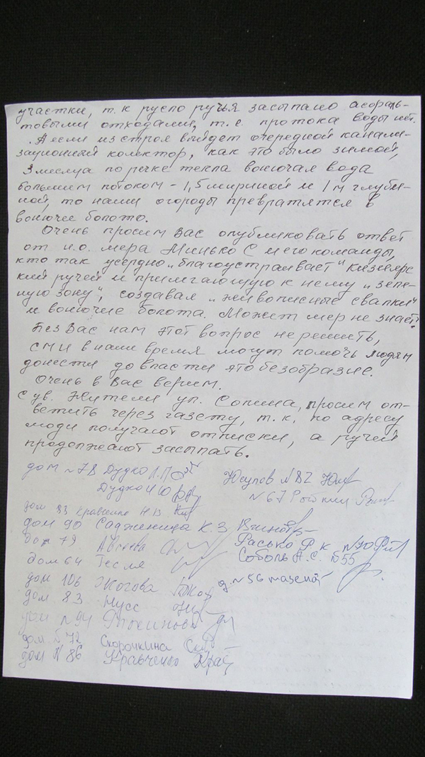 «В хороший ливень вода в Кизиярском ручье поднимается до трех метров и превращается в поток большой разрушительной силы, который потечет на наши участки, так как русло ручья засыпано асфальтом, отходами, т. е. протока воды нет…