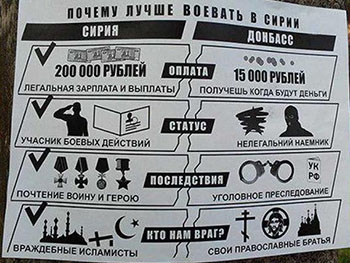 "В Сирии - легальная зарплата и выплаты, на Донбассе - получаешь, когда будут деньги. В Сирии - участник боевых действий, на Донбассе - нелегальный наемник. В Сирии - чествование воину и герою, на Донбассе - уголовное преследование", - пояснили авторы послания.