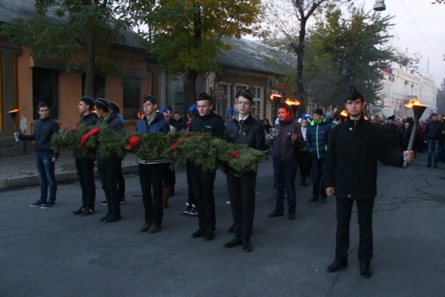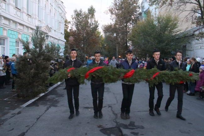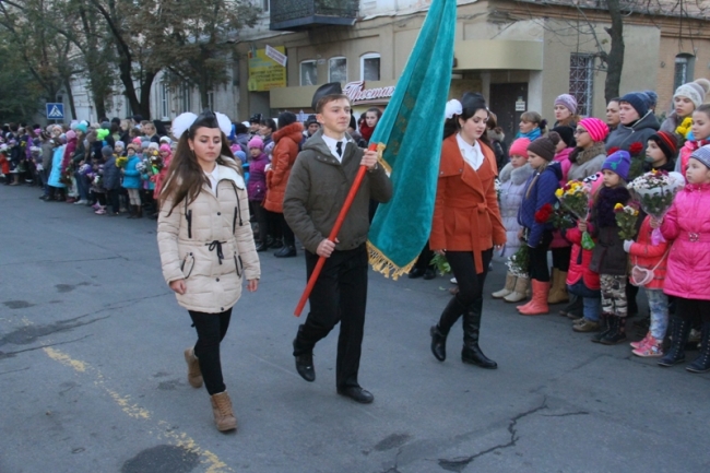 Огромная колонна от самых маленьких, до взрослых воспитанников Дворца творчества, педагогов и родителей, выпускников и неравнодушных к памяти о подвиге солдат-освободителей мелитопольцев выстроилась перед зданием Дворца. По традиции шествие начинается с торжественной линейки, на которой всем присутствующим напомнили, что 72 года назад 23 октября 1943 года доблестные войска 4-го Украинского фронта освободили Мелитополь. 12 улиц нашего города носят имена героев-освободителей. 18-ти дивизиям и соединениям присвоено наименование "Мелитопольские" за мужество и героизм, проявленные при освобождении нашего родного города. 87 бойцов и офицеров получили высокое звание Героев Советского Союза.