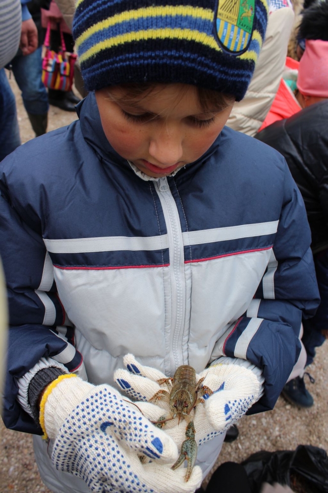 Наравне со взрослыми, работали и дети. Чтобы разнообразить детский труд и не дать заскучать самым маленьким участникам мероприятия, ребятам было поручено выпустить в озеро раков. Малыши были в восторге и принялись выполнять задание с эстафетным задором. Но при этом, каждый рак был доставлен в водоем очень бережно.