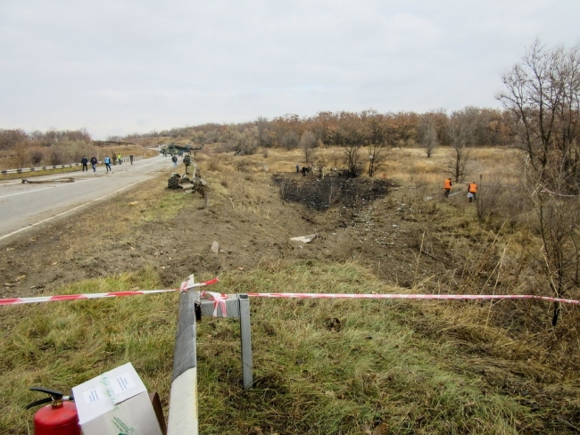 По словам очевидца трагедии, местного фермера Павла Калашника, самолет зацепил высоковольтные провода, пролетел над дорогой, задрав нос, около семисот метров чудом не зацепив идущие по шоссе автомобили, и рухнул на обочине трассы Харьков – Симферополь возле лесопосадки.