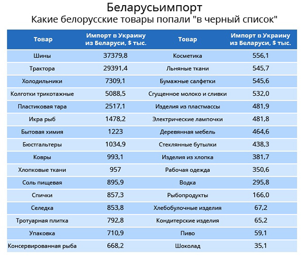 С 20 января 2016 года белорусские товары в Украине будут облагаться дополнительным сбором в 39,2% от таможенной стоимости продукции. Принято решение ввести пошлину для ряда белорусских товаров: на молоко и молочные продукты, сыры всех видов, некоторую рыбную продукцию, сахаросодержащие кондитерские и хлебобулочные изделия, шоколад, пиво, водку, соль, косметику и шампуни, спички, изделия из пластмассы, кухонную мебель, шины и покрышки, тракторы и другие товары, пишет ЛІГАБізнесІнформ.