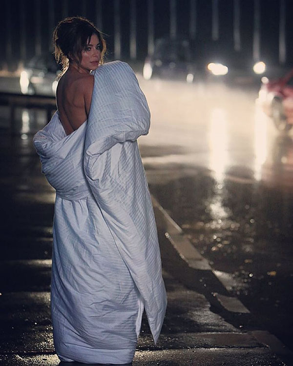 Обнаженная артистка передвигается по ночному городу в одеяле. "Одна в городе...Съемки клипа с @alanbadoev", – подписала фото Ани.