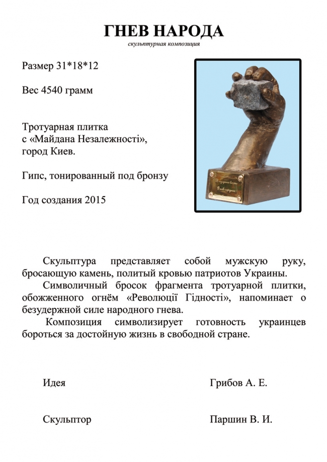 Композиция изготовлена в виде руки, бросающей булыжник с Майдана, обагренный кровью Героев Небесной сотни.
