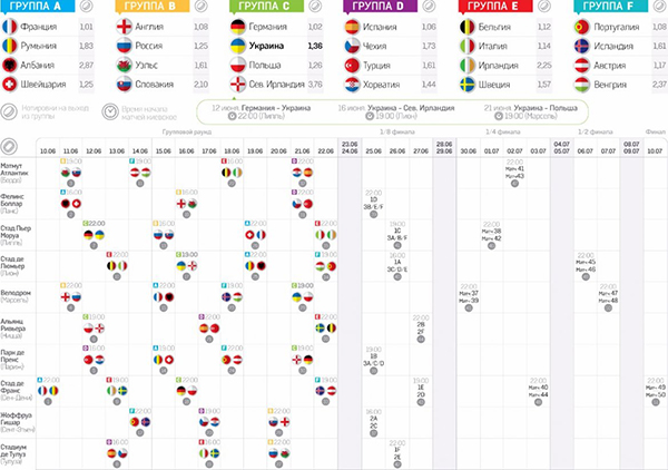 Итак, жребий брошен! На Евро-2016 Украина позавтракает в Лилле с действующими чемпионами мира из Германии (вообще немцы — четырехкратные триумфаторы плюс трижды становились чемпионами Европы), пообедает в Лионе с дебютантом финальной части ЧЕ Северной Ирландией и поужинает в Марселе с нашими соседями из Польши. Билеты можно начинать бронировать на сайте УЕФА (uefa.com) уже сегодня. Учитывая, что в 1/8 финала из группы выходят по две лучших команды, а также еще четыре лучших из шести сборных, занявших третье место в своих группах, с огромной степенью вероятности путевку в плей-офф могут обеспечить четыре очка. Букмекеры уже подсуетились и определили, что коэффициент Украины на попадание в 1/8 финала равен 1,36 (у Германии — 1,02, Польши — 1,26, у Северной Ирландии — 3,76). У нас — 12-й показатель среди всех 24 участников. Иными словами, букмекеры видят Украину в плей-офф.
