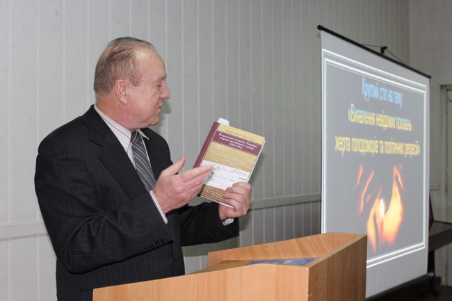 Участие в круглом столе приняли преподаватели Мелитопольского госпедуниверситета им. Б. Хмельницкого, учителя истории школ города, сотрудники МКМ. Р. Клочко ознакомил собравшихся с той работой, которая велась музейщиками ранее по данной тематике. Так, 22 декабря 1989 года по инициативе музея была создана ячейка историко-патриотического общества "Мемориал", которая ставила своей задачей возрождение национальной памяти о жертвах сталинизма. Сначала председателем общества являлся Герой Советского Союза, генерал-майор авиации в отставке Николай Опрышко. Позднее было избрано коллективное руководство, в состав которого вошли на тот момент преподаватель МИМСХа Михаил Кумок, доцент МГПИ Семен Воловник и научный сотрудник МКМ Валерий Тимофеев. Валерий Михайлович опубликовал множество статей в местной прессе по теме голодоморов, репрессированных земляков. Он собирал воспоминания свидетелей тех страшных времен, разыскивал архивные документы, вел исследования. Итогом его четырехлетней работы стала книга "Необъявленная война", которая долгое время была единственным в области изданием по этой тематике.