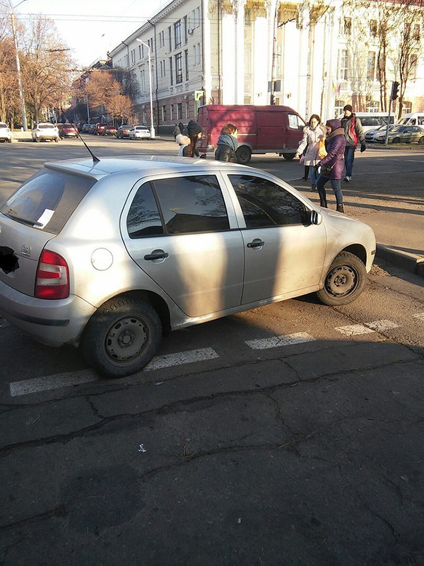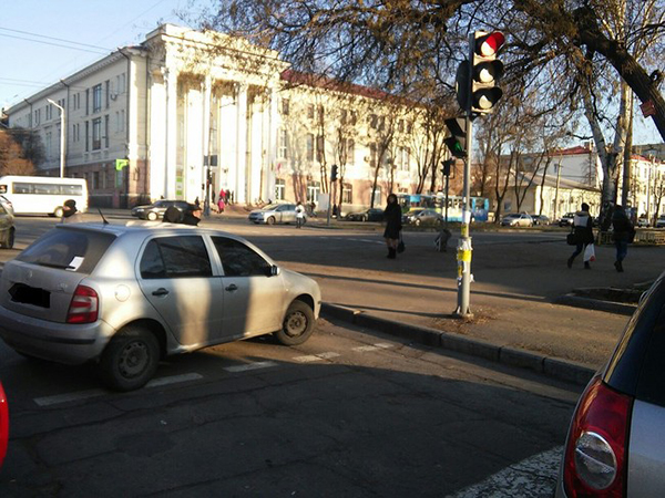 Водитель автомобиля Skoda припарковавшись, одновременно перекрыл и часть пешеходного перехода, и часть автомобильной дороги.