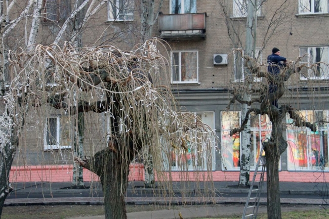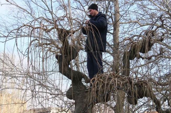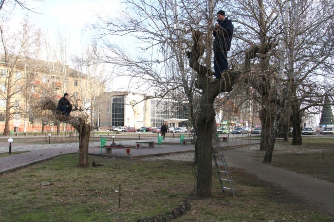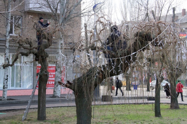 После установки главной новогодней елки Мелитополя и украшения площади Победы гирляндами, коммунальщики решили преобразить и прилегающую территорию. Сегодня сотрудники КП «Горсвет» монтируют гирлянды на плакучие шелковицы в сквере за памятником Т. Шевченко.