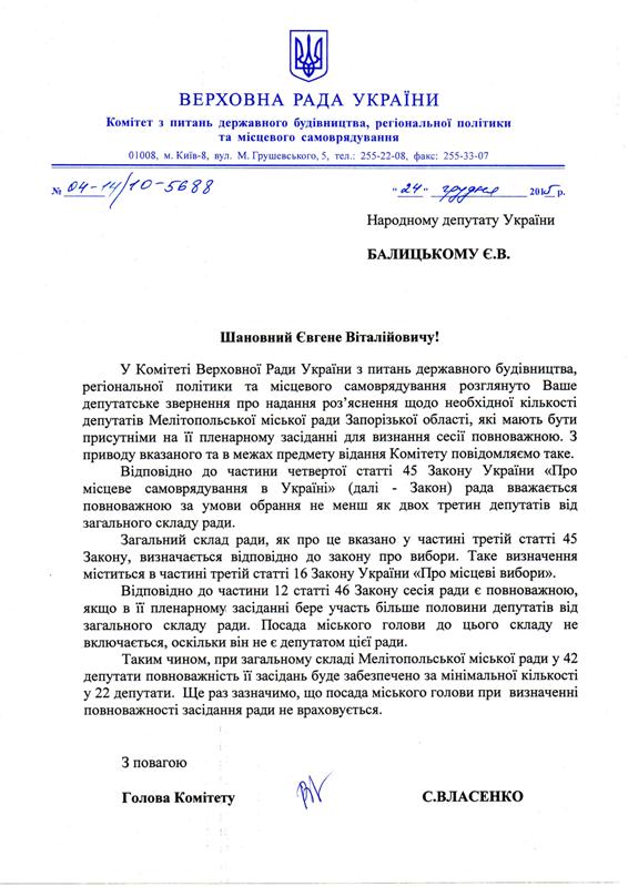 В распоряжении редакции появился документ, который, по мнению депутатов "Оппозиционного блока" и председателя мелитопольской городской избирательной комиссии Дмитрия Колесника, доказывает нелегитимность проведения сессии мелитопольского городского совета 23 декабря.