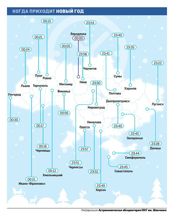 «Ровно в 24:00 праздник придет в Бородянку (городок под Киевом находится точно на 30-м меридиане). В других городах бокалы можно поднимать на несколько минут раньше или позже», — говорят в обсерватории КНУ им. Шевченко.