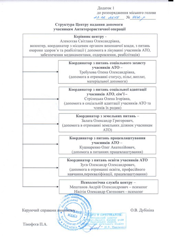 Как сообщает пресс-служба исполкома, разработаны Положение о работе центра, его структура и схема взаимодействия с исполнительным комитетом и местными органами исполнительной власти. Также определены координаторы по вопросам соцзащиты, соцадаптации участников АТО, трудоустройства, образования, по земельным вопросам, а также психологическая служба центра.