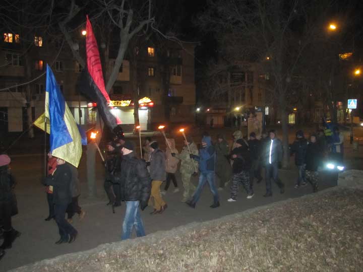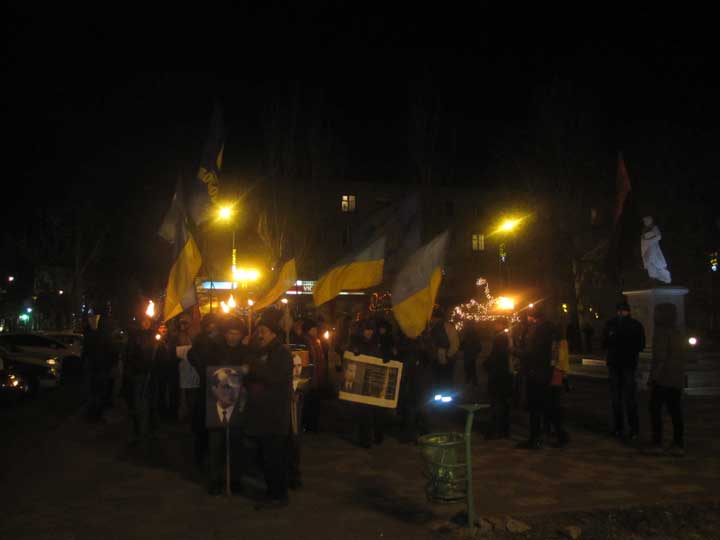 Затем с зажженными факелами организованной колонной активисты прошли по проспекту Б. Хмельницкого до памятника украинскому гетьману, выкрикивая лозунги: "Слава Украине!" - "Героям слава!", "Украина превыше всего!", "Смерть врагам!" - "Слава нации!", "Москаляку на гилляку!". Отношение прохожих к этой акции было неоднозначным: водители авто сигналили, поддерживая активистов, редкие прохожие с интересом останавливались, одни откликались на лозунг "Слава Украине!", другие бросали в след "фашисты", "расисты". Еще крепки в сознании очень многих людей заложенные в советское время "страшилки" о том, кто такой Бандера и чего добивались бандеровцы.