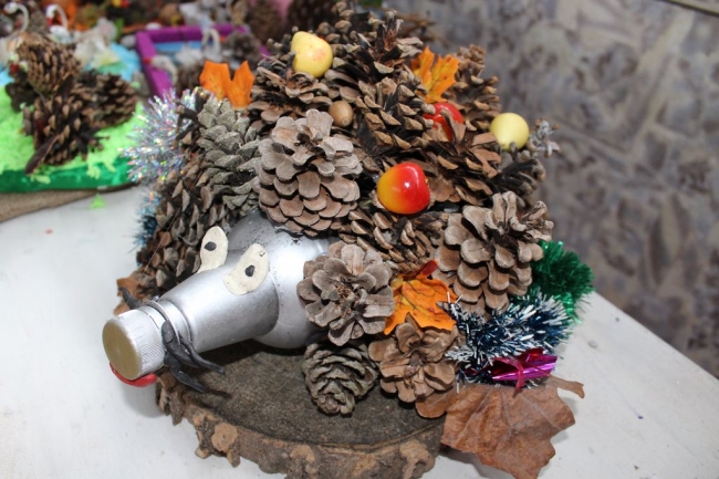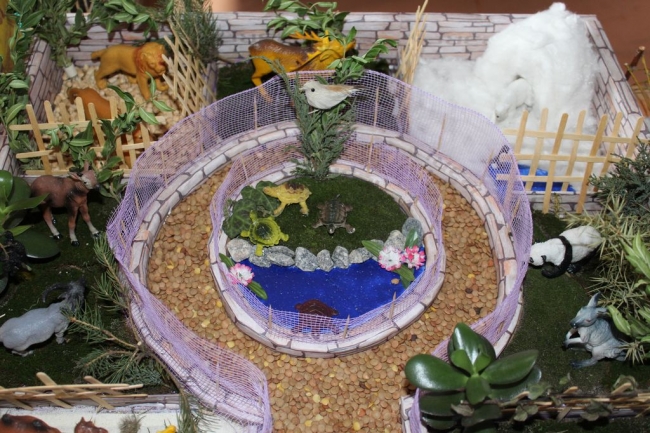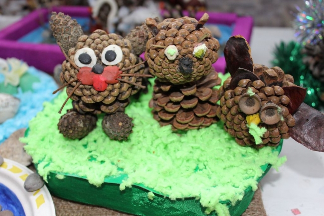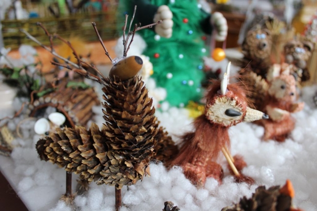 Еще одним заданием Феи было создать коллективную творческую работу из природного материала. Ребята отпустили в полет свою фантазию и принялись мастерить любимых зверушек из шишек и коры деревьев, семян и круп, перьев и меха, ракушек и бумаги, соломы и овощей, каштанов и бисера, высушенных листьев и спичек, пластилина и ниток. А педагоги и родители затем оформили все их поделки в завершенную композицию под названием "Наш зоосад". Когда смотришь на эти работы, диву даешься мастерству, творческим находкам, юмору детей и взрослых, той любви, с которой сделаны эти удивительно симпатичные сказочные зоопарки. Следует отметить, что композиции были выставлены в одном из классов ЦЭНТУМ и эту импровизированную выставку с удовольствием посетили 800 воспитанников экоцентра и ребята, которые приходили в центр на новогодние утренники.