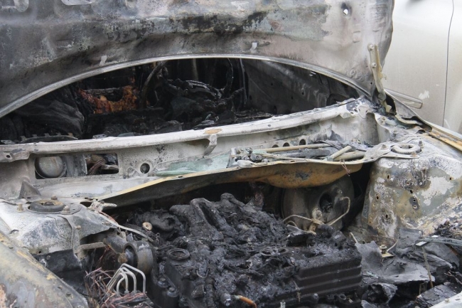 У Тойоты выгорел моторный отсек, салон и багажное отделение. На фото видны два очага возгорания - моторный отсек и багажник, что позволяет предположить поджог.